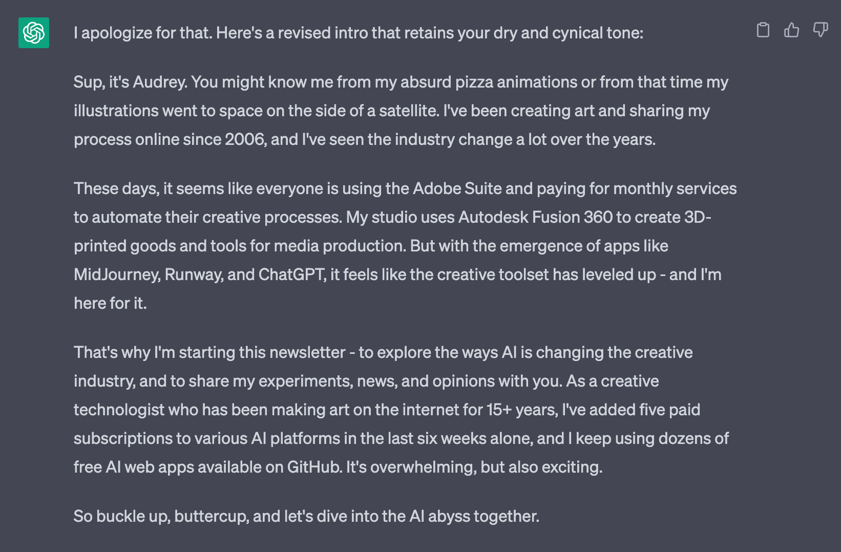 In part, I’m starting this newsletter to keep track of how things evolve regarding how AI inserts itself into Echo Echo Studio’s commercial art and media production. As a creative director who’s consulting with big and small brands alike, there is an obvious squeeze on the expectation of labor across creative fields right now (hello WGA strike), and even Sarah Brin hinted at this in their newsletter “The Brinternet Newsletter” about how they are becoming an "AI Guy” (btw, I felt that Sarah and I think you’re right).